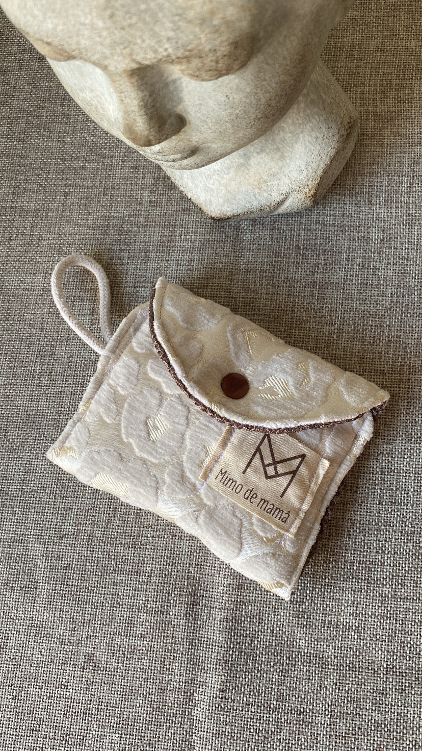 Pequeña cartera hecha con tela de tapicería, con gran capacidad para guardar tus tarjetas y algún billete.
