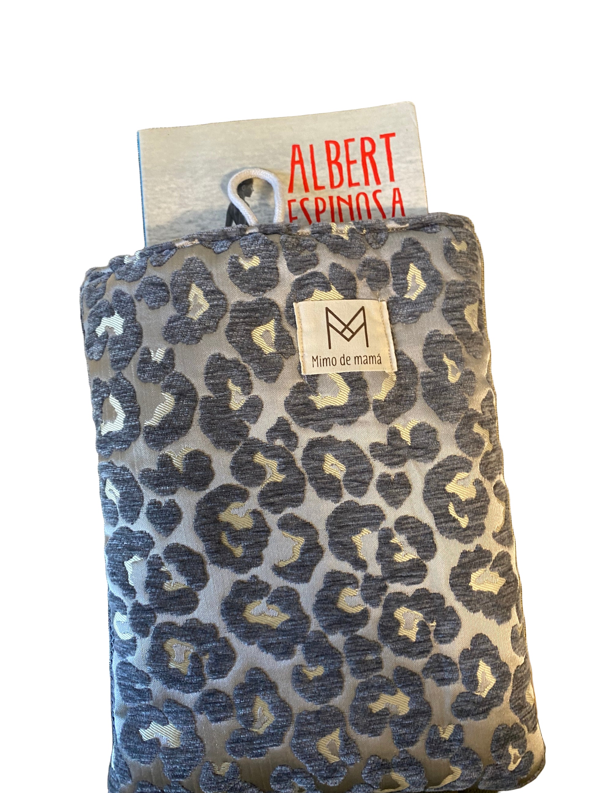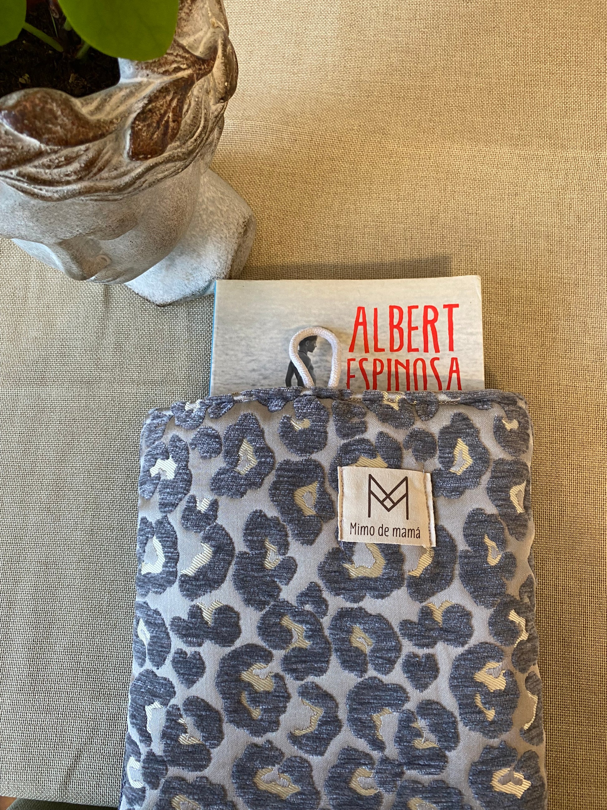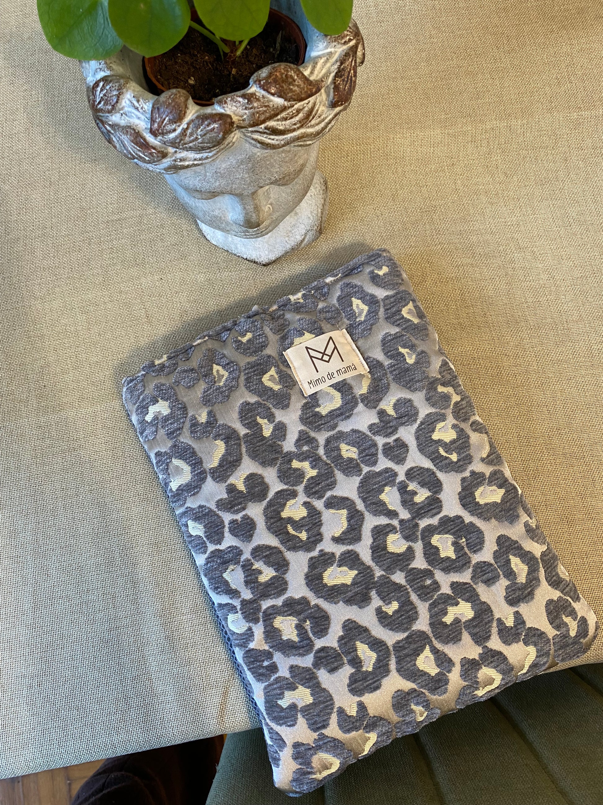 Funda para tablet o libro, hecho con tejido de tapicería en una tela de terciopelo gris.
